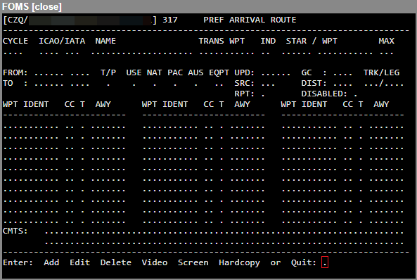 DISABLED | Use <Y> or <N> to allow users of the FOMS 316/317 menus to know when any of their preferred departure/arrival routes are no longer valid based on the latest AIRAC data. This allows easy identification of entries requiring an update. |