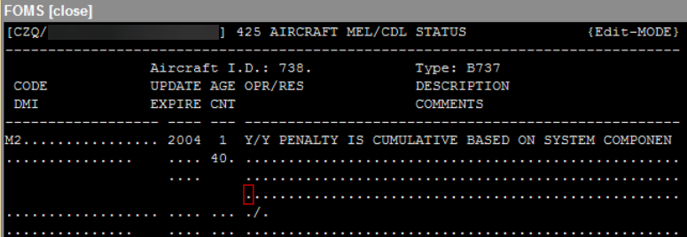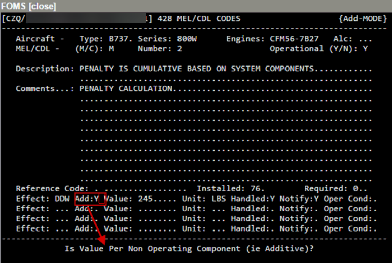 Fields in the FOMS 428 / WebFOMS MEL/CDL Dictionary and FOMS 425 / MEL CDL Assignments screen allow you to calculate cumulative MEL/CDL penalties. You can maintain a single penalty effect on a MEL or CDL code. To indicate that a penalty is cumulative a user must set the Is Value Per Non Operating Component to <Y> in the FOMS 428 menu or WebFOMS MEL/CDL Dictionary screen.