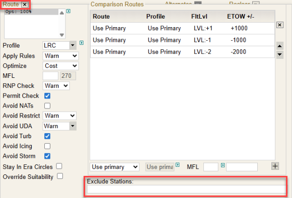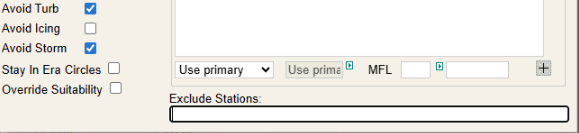 If you have set the Show All EEP/EXP field to Yes and have checked the Force Re-default ETOPS field in ETOPS/EEXP group in the Enroute Stations tab of the Airline Code Parameters WebFOMS screen, any station entered in this field will not be selected as a suggested ETOPS station when a Route Analysis is performed. This selection remains even if a new route is chosen from the Plan screen.