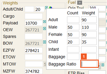 Baggage can be entered as an exact count of bags, with an associated weight, or as a ratio, relative to the number of passengers.