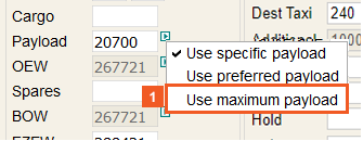 - If Use maximum payload is selected, the Pax, Cargo, and EZFW fields are disabled.
