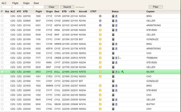 The flight list contains a scrollable list of flights in the system that meet the filtering criteria. By default, these are all flights in the system from six hours before the current time to 12 hours from the current. The flight list also allows flights to be assigned to groups. Users can then filter the flight list based on these flight groups. Users can also be assigned to groups to determine which flight groups they are interested in viewing.