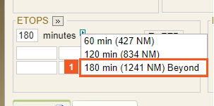 For you to be able to determine whether you are using an ETOPS Beyond 180 Minute scenario for your Flight Plan calculations, the ETOPS section of the Plan Screen contains an indicator label.