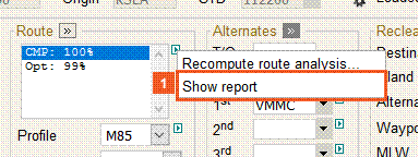 The Route Analysis, whether displayed in the Route Group on the PLAN UI, or here in the ROUTE UI, will display the available routes ordered by the selected optimization method. Possible optimization methods include Least Cost, Least Fuel, and Least Time.