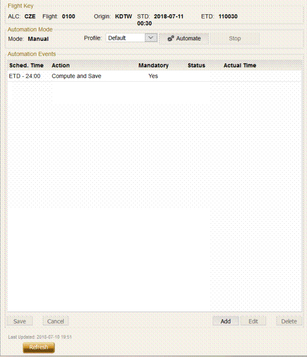 The Automation Interface allows for selection of automation profiles, Add/Edit/Delete of Automation Events on a flight-by-flight basis, and viewing the status of the various Automation Actions.