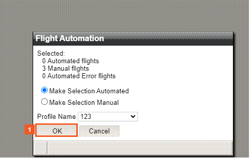 The number of automated, manual and automated error flights that were selected before opening the Flight Automation dialog are displayed. Radio buttons allow automation of the selected flights, or place them in the manual state. Clicking the OK button makes the indicated state change to the flights that are not currently in that state. Clicking Cancel closes the Flight Automation dialog with no changes in state for any flights being made. You can also choose the automation profile, see the Automation Defaults Tab topic for more information on profiles.