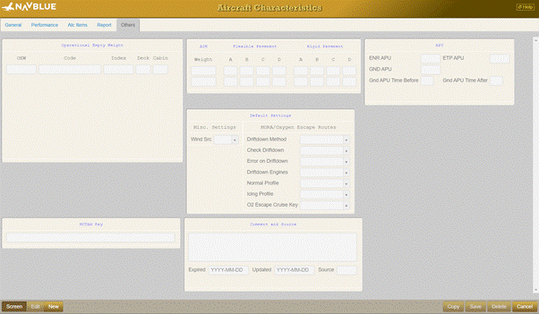 The Others tab is where the OEW is set, where ACN & PCN values are set and APU defaults are set. Also driftdown settings are located here. Comments can be entered as well.