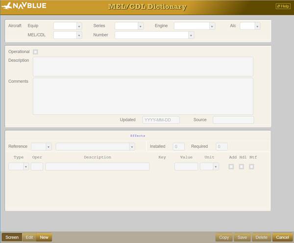 Use this program to create and maintain a data file of Minimum Equipment List (MEL) and Configuration Deviation List (CDL) code numbers and their corresponding explanations and descriptions. The descriptions are limited to either 50 or 60 characters depending on the classification of the item: operational or non-operational respectively. The descriptions are not intended to be definitive; the objective is to make them detailed enough to alert dispatchers to any restrictions that may affect flight planning. In addition, you can also assign various effects to individual items, which will change the flight plan computation.