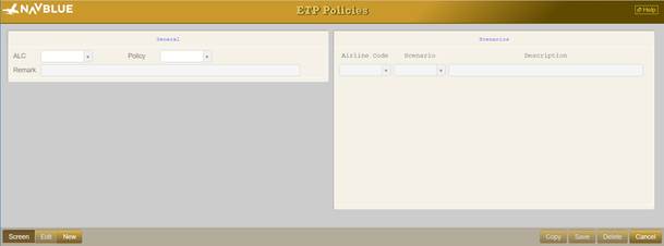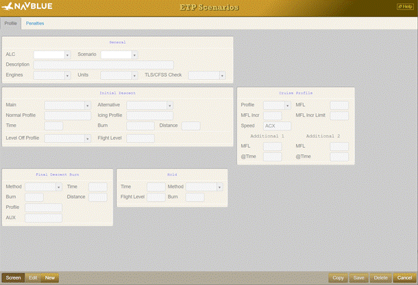Use this program to group one to six different ETP calculation scenarios together as a single policy. This can be assigned to an individual aircraft. The ETP calculation routine within the flight plan program is capable of calculating the fuel requirements according to six different scenarios for each pair of ETP alternates. This program allows control over the scenarios that are used for any given aircraft. The copy function is only available through the WebFOMS screen.