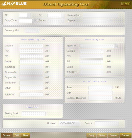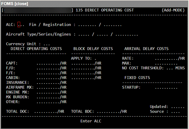 This program is used to store and manage direct operating costs (DOC) associated with the operation of their aircraft. The data stored in this database is used by the flight planning system to in determining the optimized cost flight plan and routing.