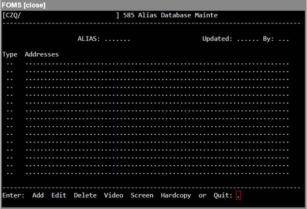 Use this program to maintain the Alias Database. An Alias allows you to specify multiple addresses under a single identifier and is used for all types of addresses, including email. The address Alias program allows you to update information that is on file for each Alias in the data file.