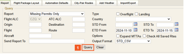 The Missing Permit Report tab allows you to create and export a report of missing permits for the flights in the given range.