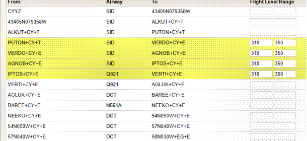 For example: YYZ+CY, YQT+CY J500 YOW+CY, AREA CY:609M, FIR CZYS, FIR CZUL, FIR CZWG