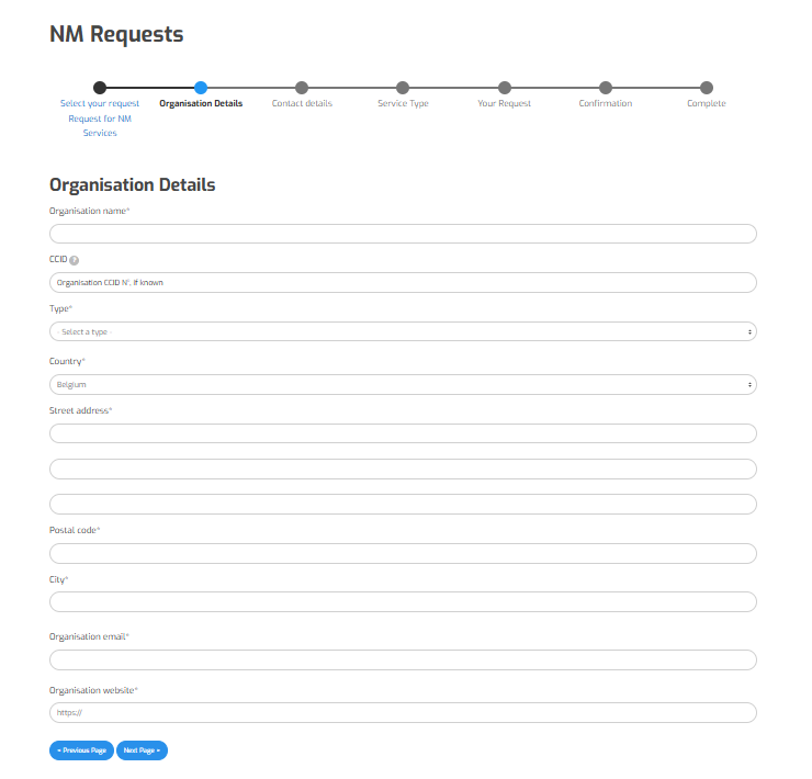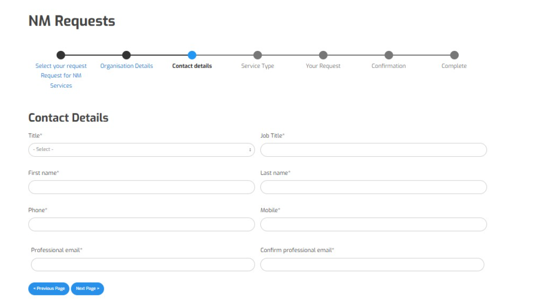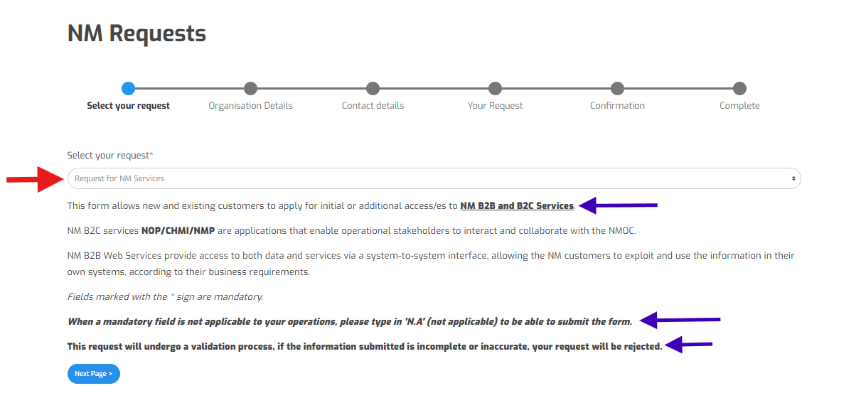 To apply for an NM B2B Ops or Pre-Ops certificate, start by clicking the NM Request Site link (https://www.eurocontrol.int/form/nm-requests).