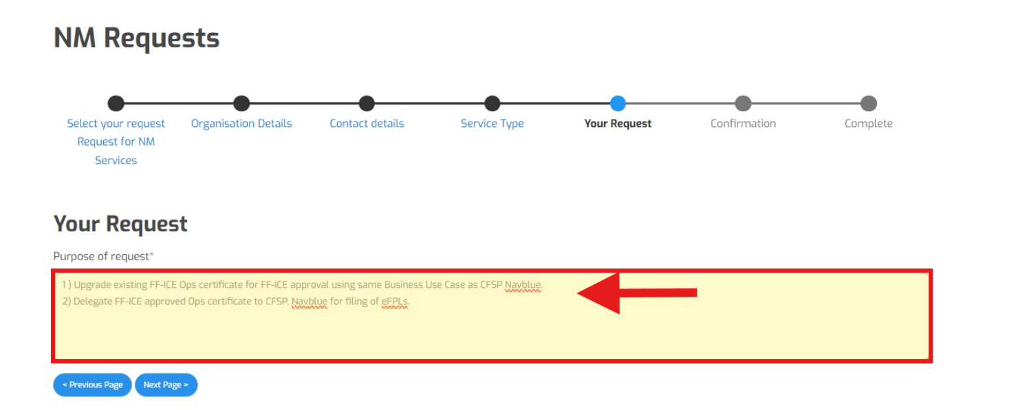 In the “Purpose of request” input field, enter details and comments similar to the description shown in the image.