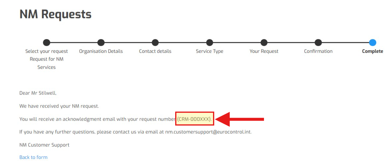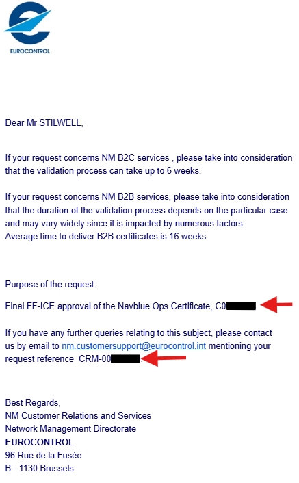 Once the completed screen appears, you are notified by email with a CRM number. Please include this number in any Support ticket with NAVBLUE when requesting FF-ICE configuration, along with any other relevant information.