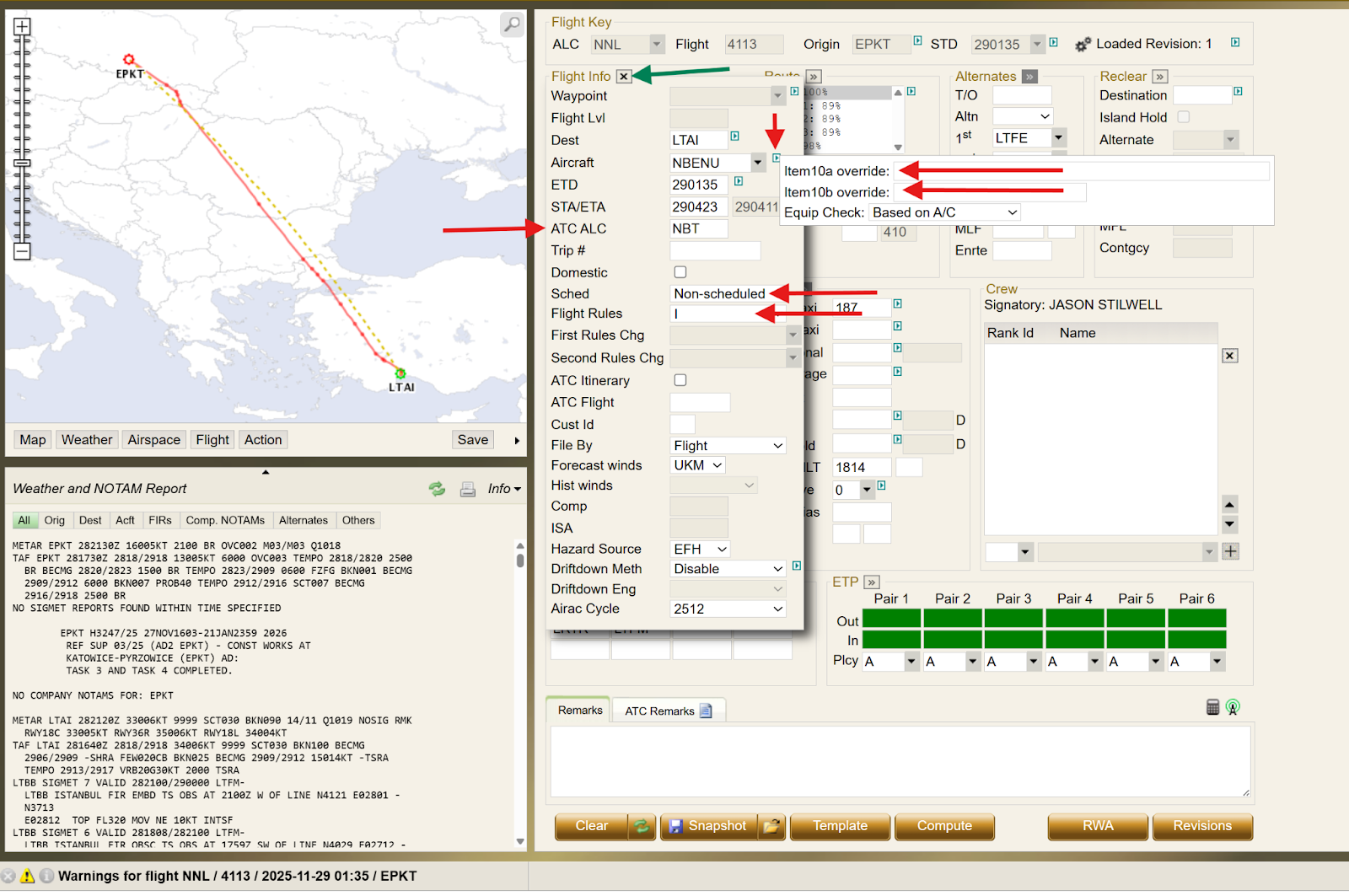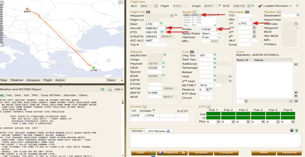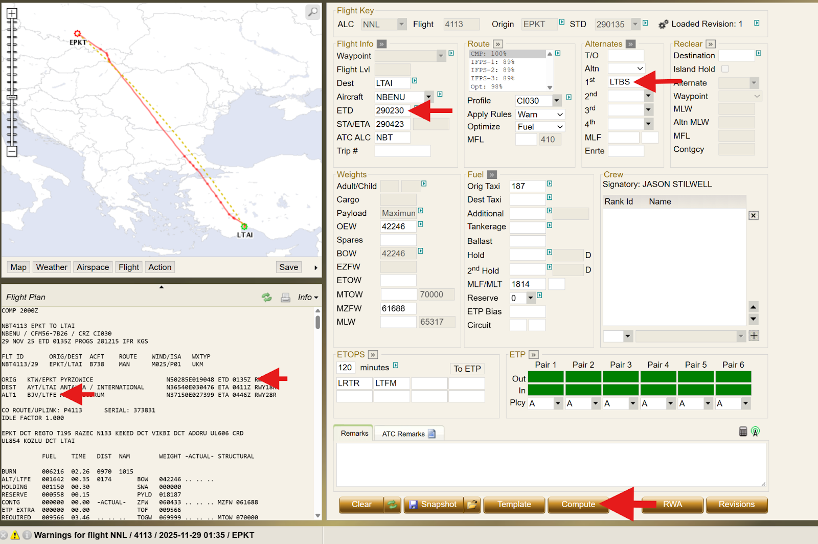 The data fields for ETD and ALTERNATE are then updated to 0230 and LTBS, respectively. Once these changes are completed, the Flight Plan must be computed.