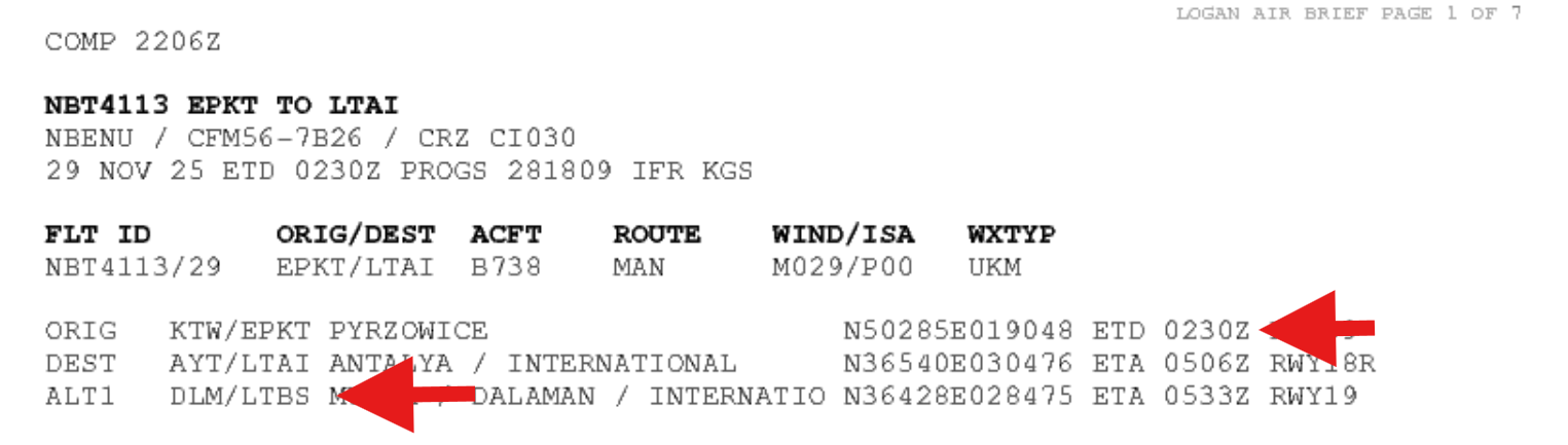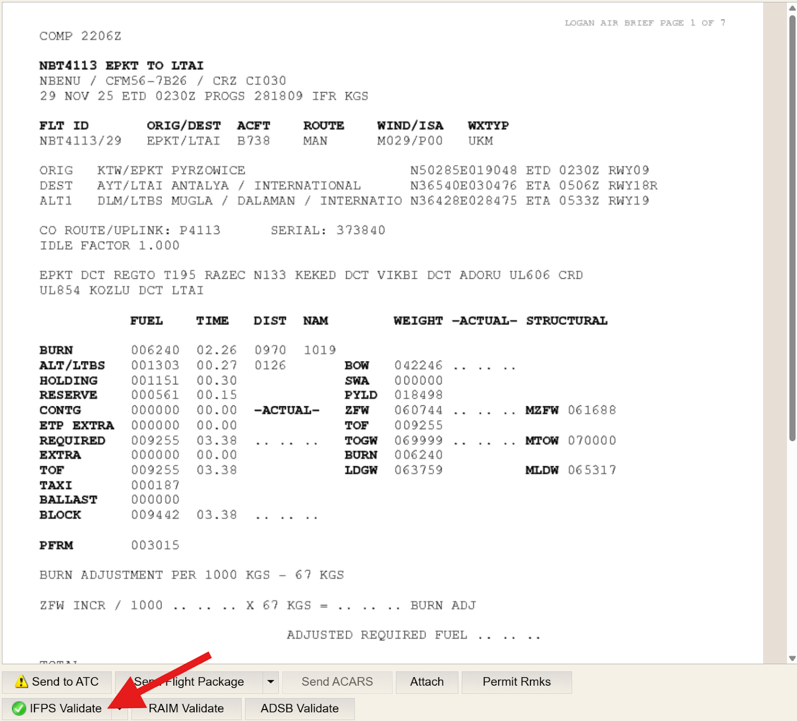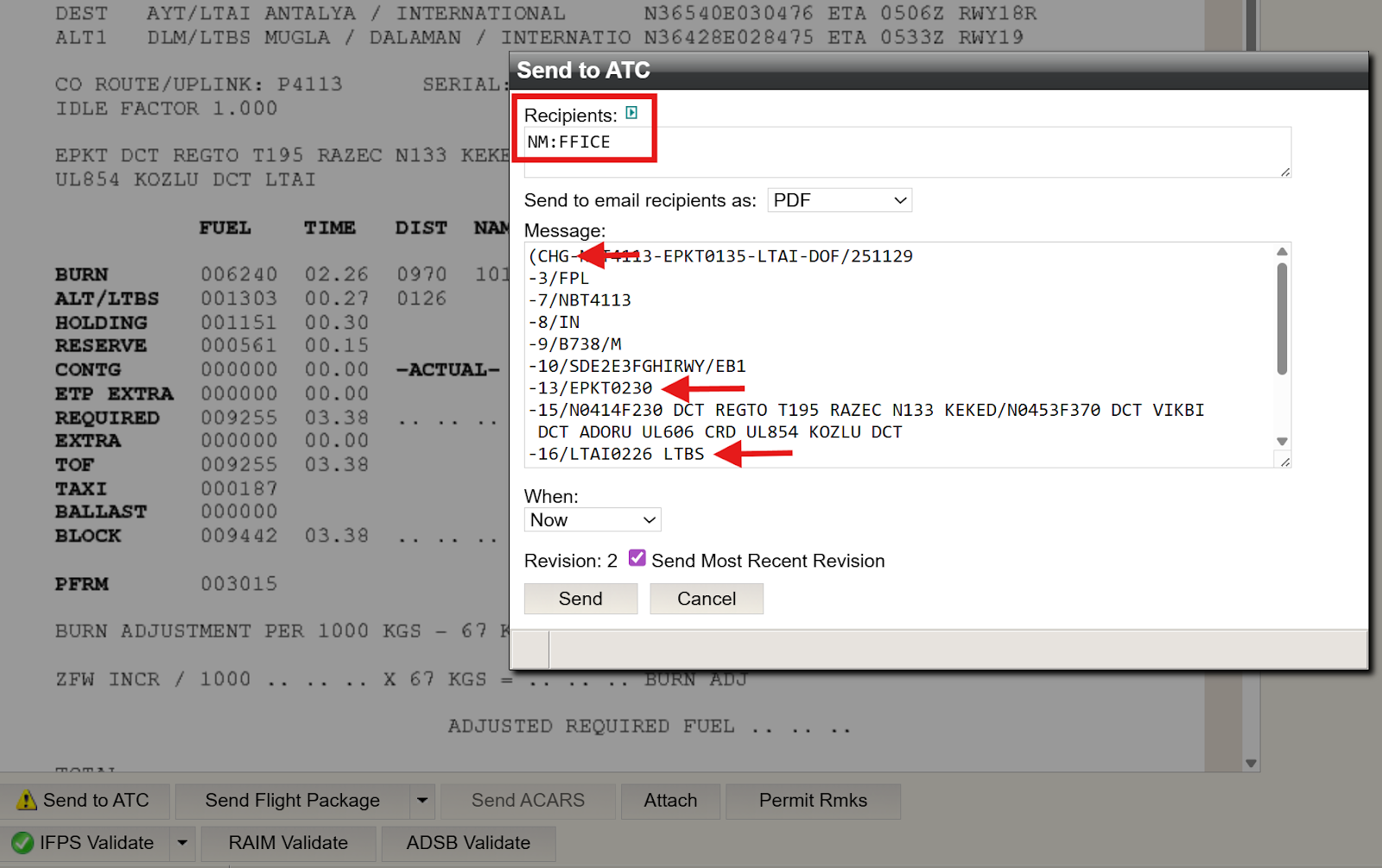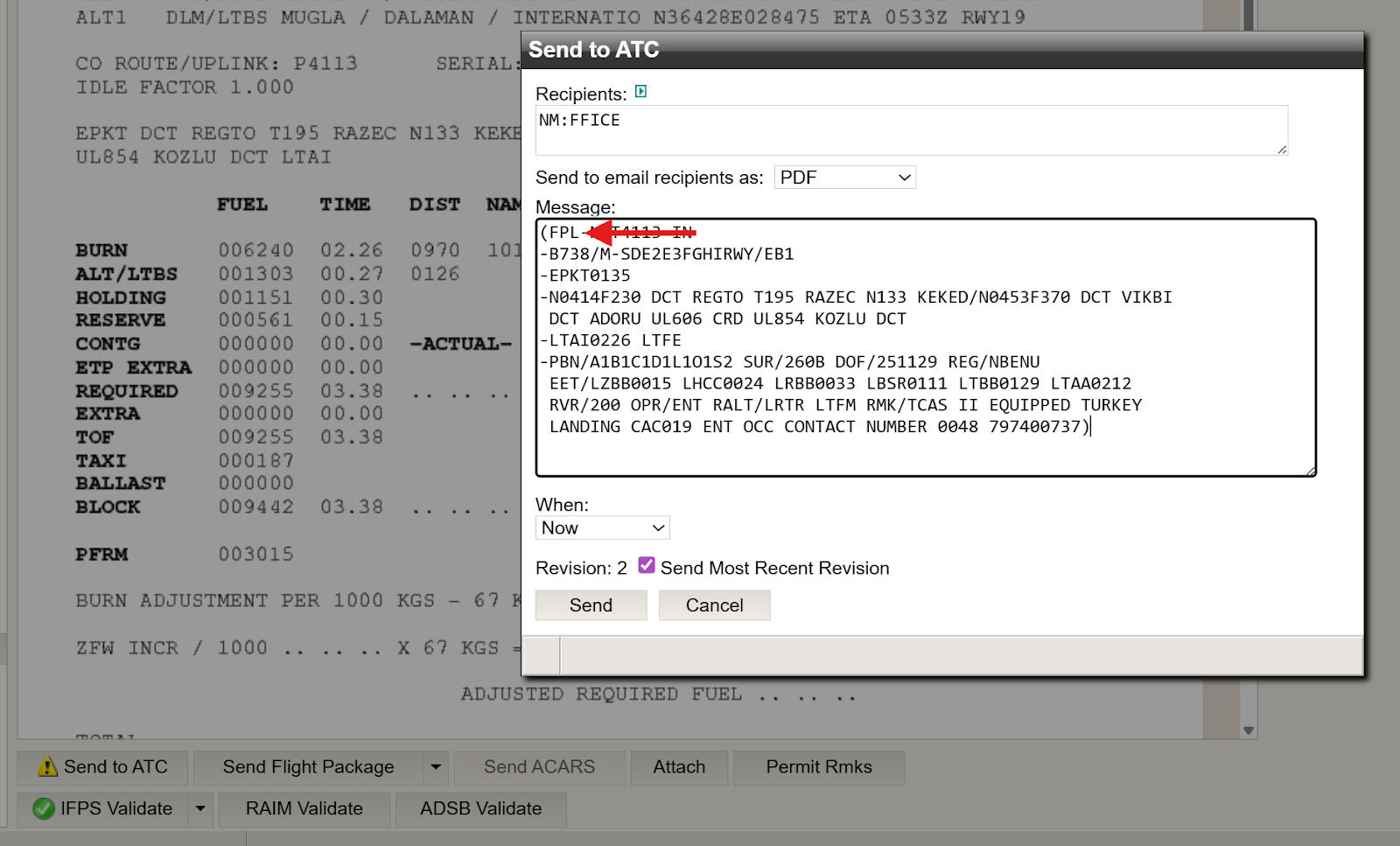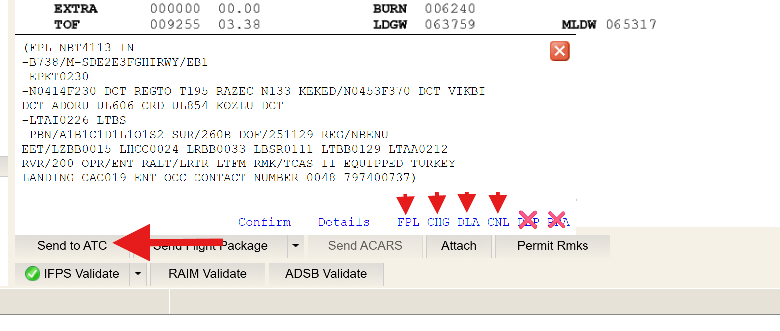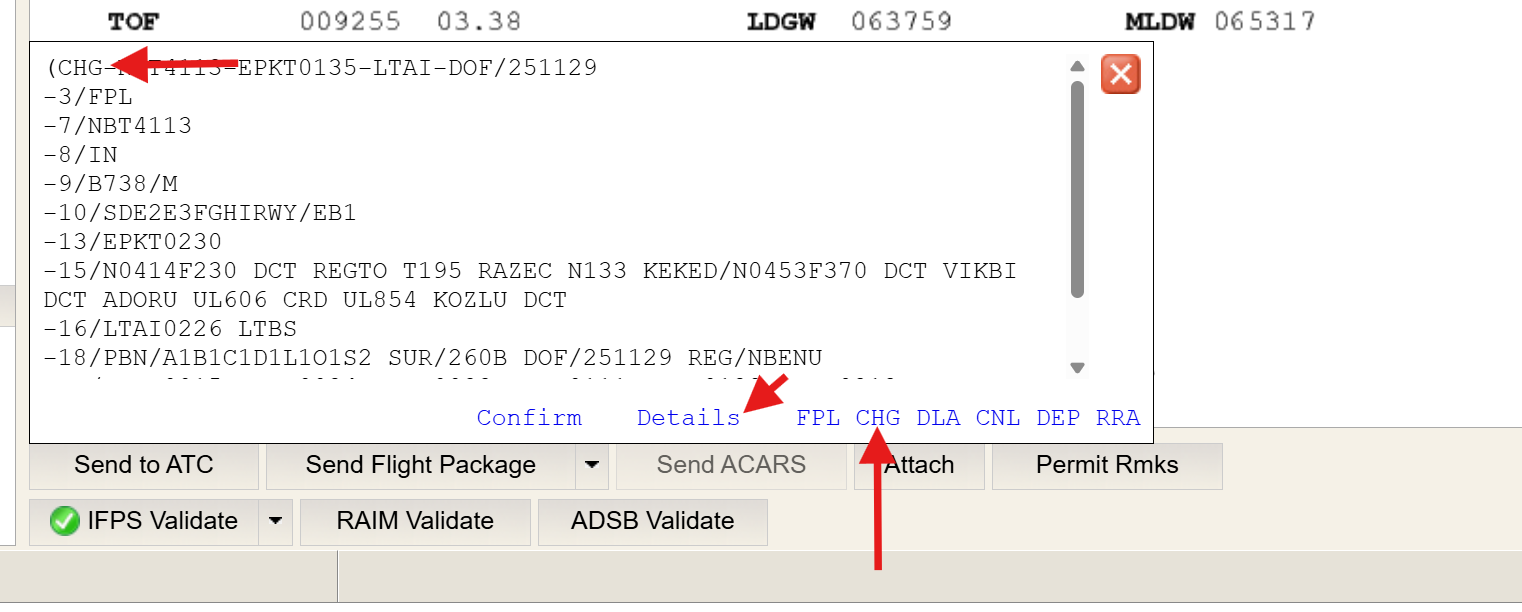 In this example, the computed Flight Plan change follows the steps outlined earlier. Note the change to departure time (from 0135 to 0230), and the change in alternate selection (LTBS). Once the Flight Plan has been computed and validated as described above, select CHG in the Send To ATC dialog box, then click Details.