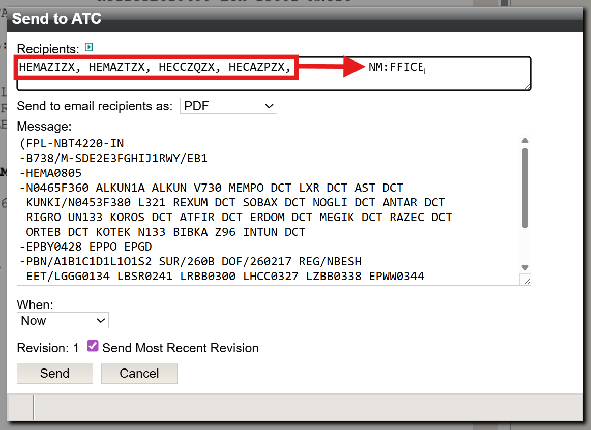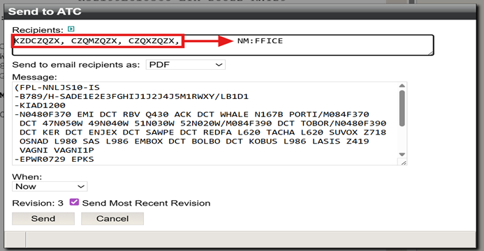 For the next flight, the NM:FFICE address displays first, however this has no effect on how an FF-ICE FPL is filed. Regardless of where the NM:FFICE address appears in the Recipients box, an FF-ICE FPL will still be filed.