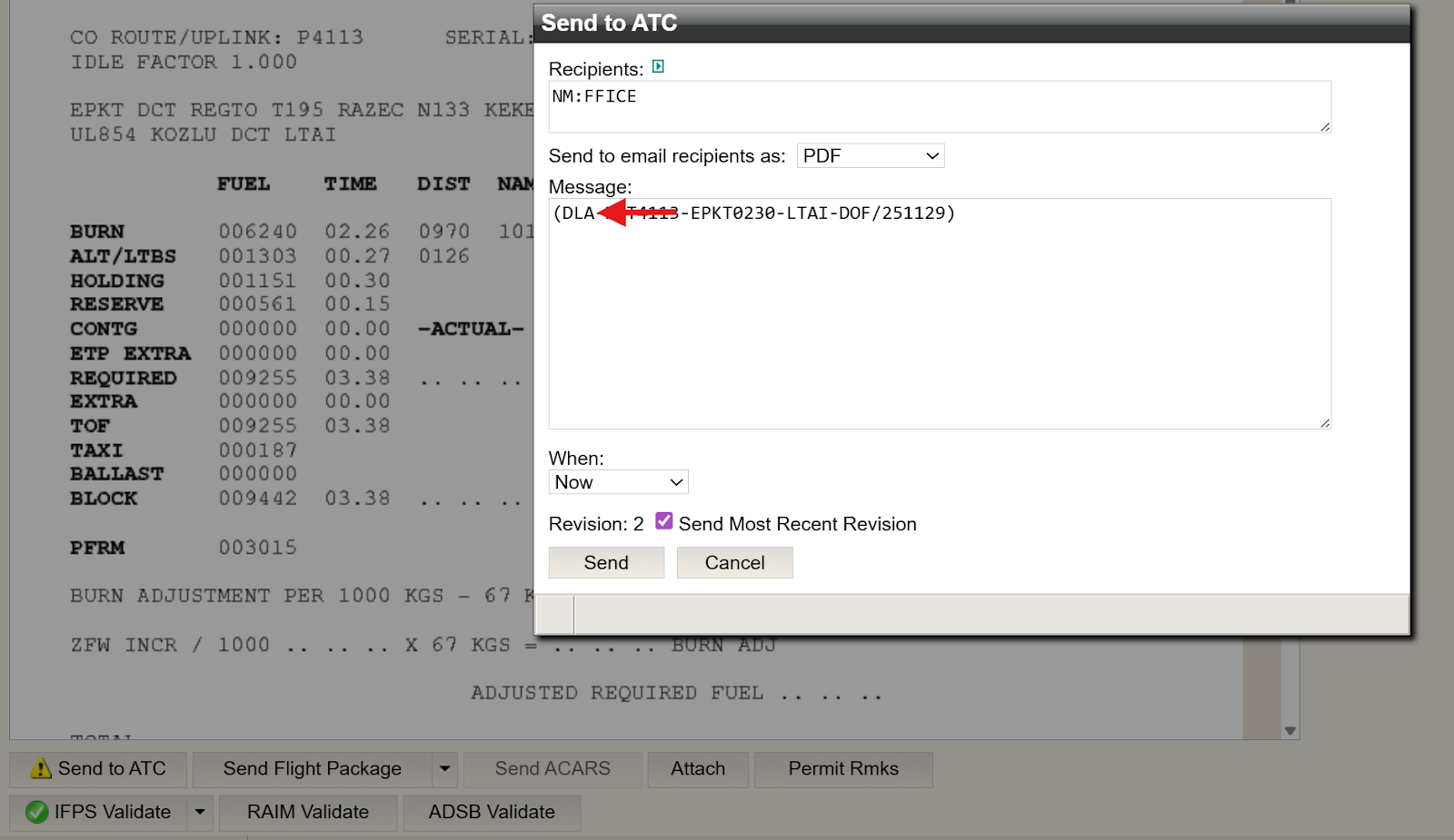 Once Send is clicked, an FF-ICE/FIXM formatted DLA message will be submitted to NM.