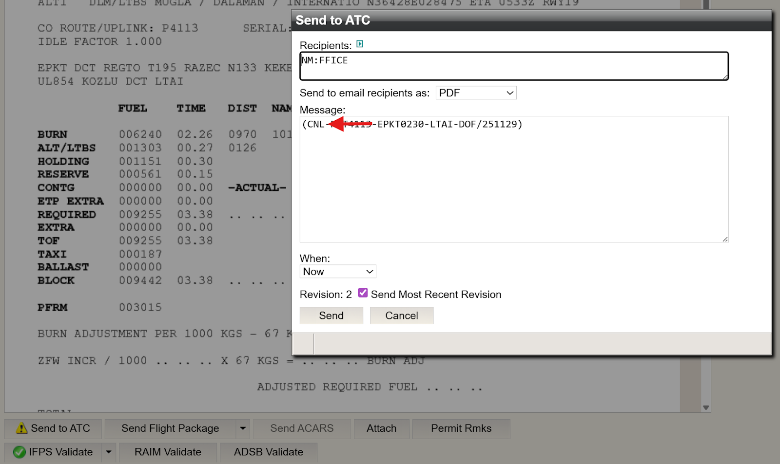 Once Send is clicked, an FF-ICE/FIXM formatted CNL message will be submitted to NM.