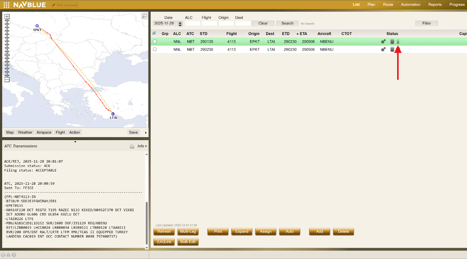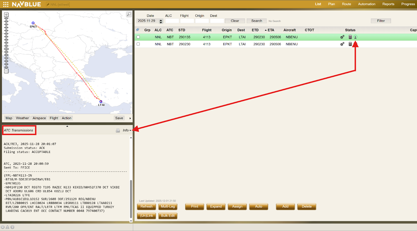 To view the response message from Eurocontrol (NM) after submitting an eFPL, return to the List screen in N-FP.