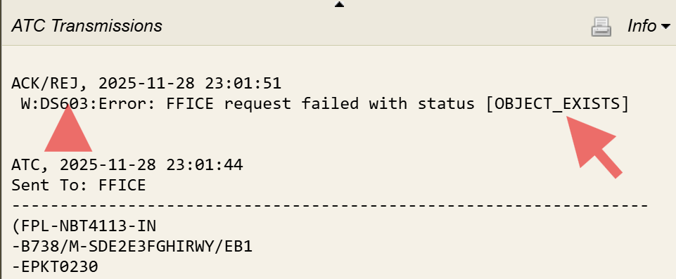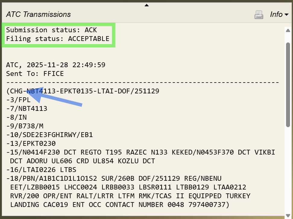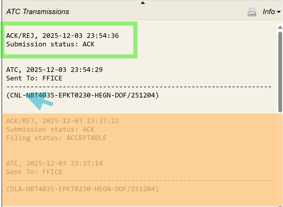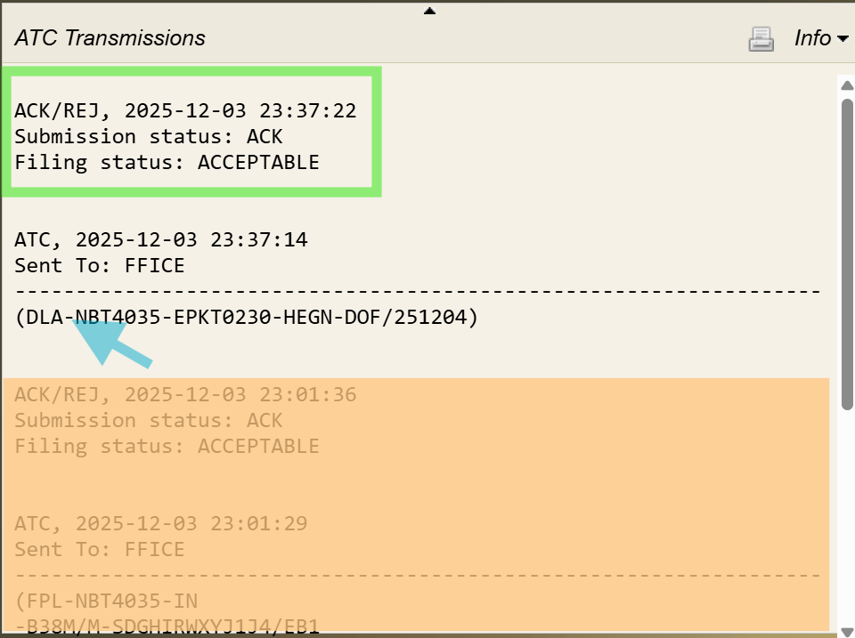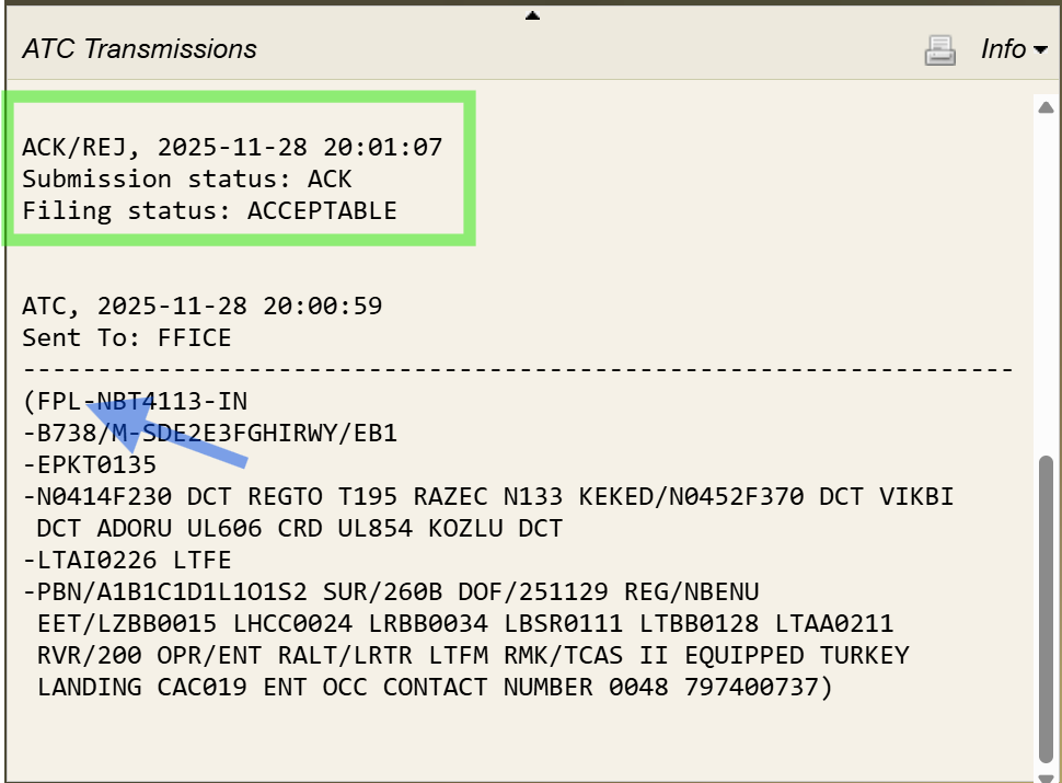 Once the Initial FPL is filed, the response message for the flight appears in the Info window, which may take a few moments to update after the Flight Plan (FP) is submitted. The response message format is the same whether the flight is submitted using automation or filed manually.