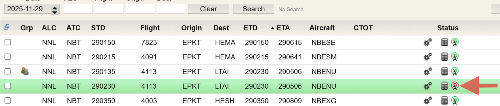 From the List screen, click the flight you want to review. In this example, the selected flight is NBT 4113 flight with a STD of 290135.