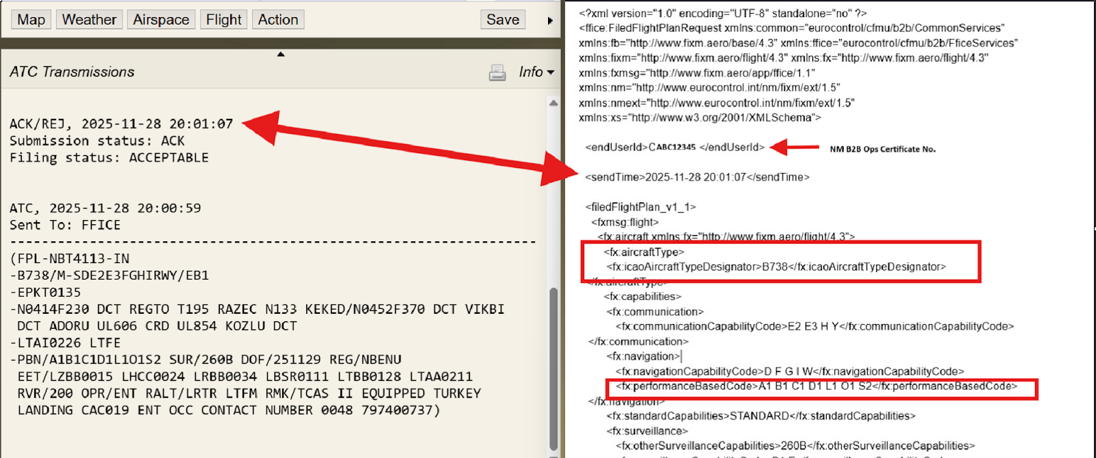 The image below shows a side-by-side comparison of the ICAO2012 FPL format displayed in the Info window–shown as part of the translated FF-ICE message response from NM– and the actual FF-ICE FIXM formatted message submitted to NM (shown on the right).