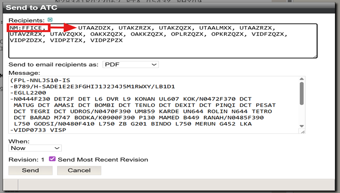 When configured to file an FF-ICE eFPL, N-FP can include a request for NM to translate the FPL to ICAO2012 and forward it to downstream, or upstream AFTN / SITA addresses outside the EU IFPZ. To file, Dispatchers must ensure AFTN/SITA addresses for a translated FF-ICE to ICAO2012 FPL are included in the Recipients box of the Send To ATC window. They must also add the NM:FFICE address.